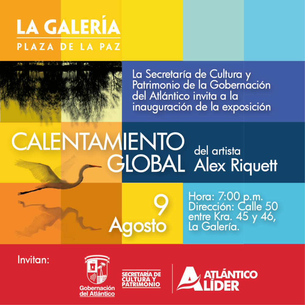 La Secretaría de Cultura y Patrimonio de la Gobernación del Atlántico, por medio de La Galería Plaza de la Paz, sigue abriendo las puertas al arte con el fin de generar nuevos discursos que permitan, al público del departamento, tomar decisiones frente a las distintas realidades que se afrontan en la actualidad. Por ello, invita a la apertura de la exposición ‘Calentamiento global’ del artista Álex Riquett.