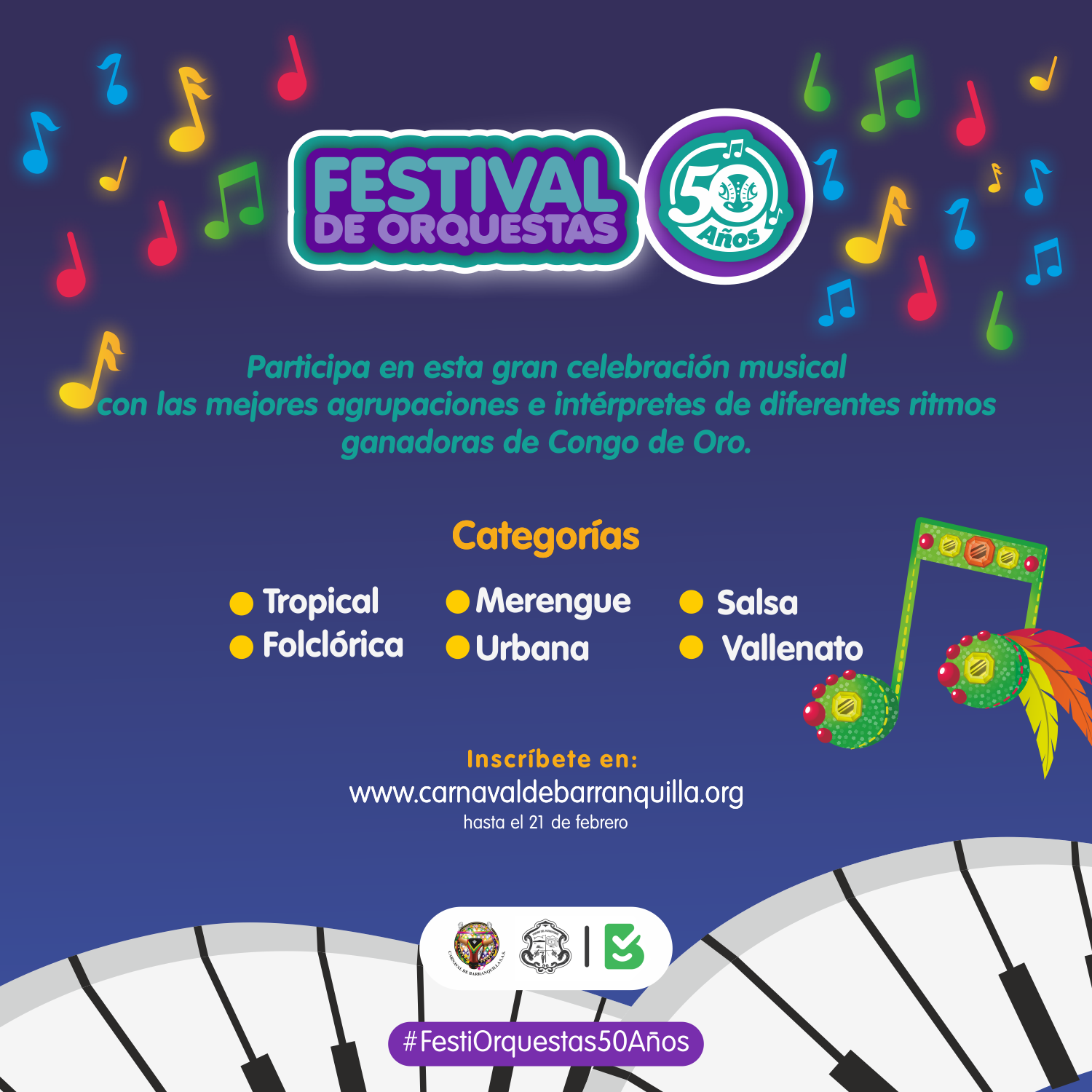Carnaval de Barranquilla S.A.S., invita también a las orquestas, agrupaciones musicales e intérpretes a inscribirse hasta el 21 de febrero para el Festival de Orquestas 2019, que celebra en grande su aniversario número 50, y que contará con grandes artistas ganadores del Congo de Oro, máximo galardón que entrega la fiesta, en años anteriores.