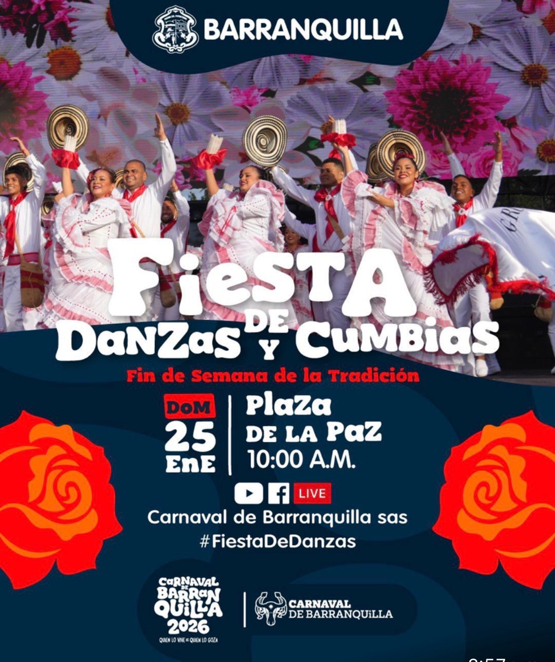 El domingo, 25 de enero, desde las 10:00 de la mañana comenzará la Fiesta de Danzas y Cumbias, donde las manifestaciones que exaltan el patrimonio inmaterial del Carnaval se presentarán en la Plaza de la Paz ante el público barranquillero, recordando el valor de quienes, generación tras generación, han mantenido viva la esencia del Carnaval de Barranquilla. También, a las 3:30 p.m. en el Centro Comercial Carnaval, se realizará el primer Paco Paco al Parque, una jornada pensada para la diversión de los niños y las familias.