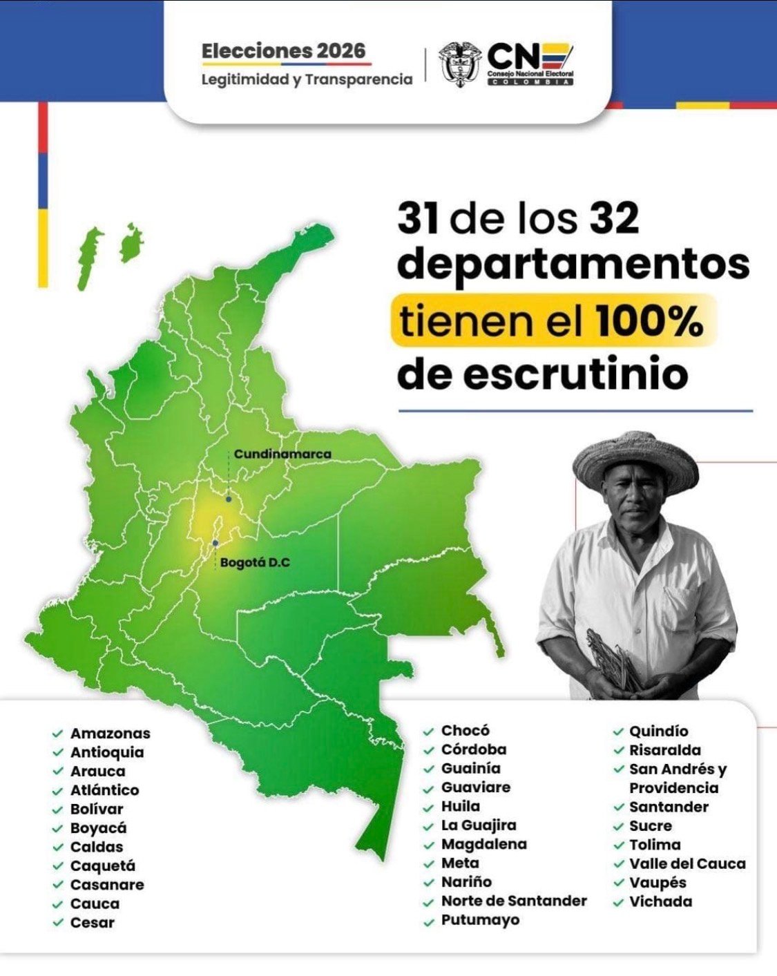 El Consejo Nacional Electoral ratificó hoy que 31 departamentos del país, con el Atlántico en los sitiales de honor, ya finalizaron sus escrutinios. La entidad destacó el compromiso de todos los actores del proceso y aseguró que se brindaron plenas garantías de legitimidad y transparencia. Con este resultado, el CNE fortalece la confianza ciudadana en el sistema electoral de cara a las Elecciones 2026