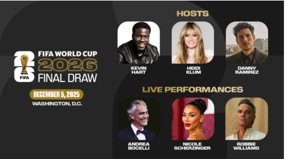 La FIFA presentó hoy el elenco de artistas que acompañará la ceremonia del sorteo final de la Copa Mundial de la FIFA 2026™, que se celebrará este viernes 5 de diciembre a las 12:00 ET (18.00 CET) en el histórico Centro John F. Kennedy para las Artes Escénicas de Washington D. C. El acto, que se espera que atraiga a millones de espectadores en todo el planeta, reunirá a algunas de las personalidades más destacadas del mundo del espectáculo en la antesala de un momento emblemático para el fútbol.