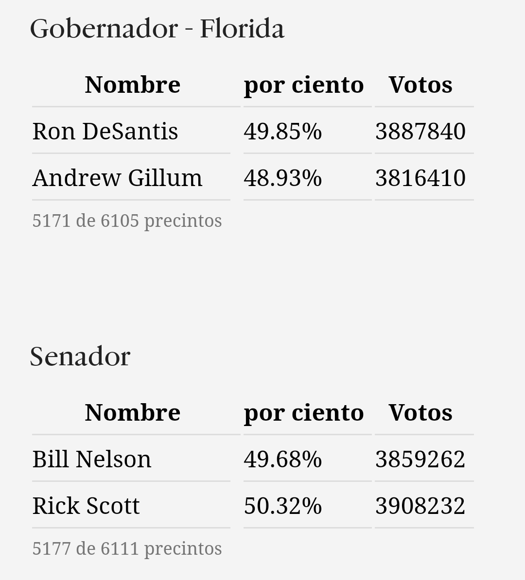 El Estado de la Florida en espera de resultados finales en la reñida contienda electoral busca nuevo Gobernador y Senador,por la gobernación estatal compiten el republicano Ron de Santis,y el democrata afroamericano Andrew Gillum,