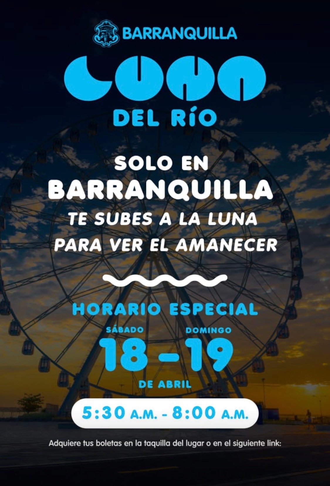 Este sábado 18 y domingo 19 de abril, barranquilleros y visitantes tendrán la oportunidad de observar los colores y el espectáculo natural que ofrece el cielo de la ciudad desde la Luna del Río, gracias al horario especial habilitado por la Alcaldía de Barranquilla, desde las 5:30 a. m. hasta las 8:00 a. m. podrán subir y contemplar los primeros rayos del sol sobre de la ciudad, una experiencia que te asegura capturar imágenes maravillosas.