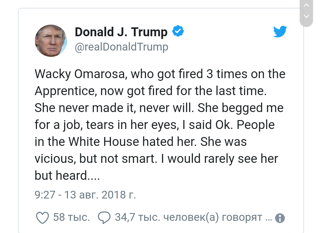 «Cuando Kelly se unió a nosotros, me dijo que [Manigault Newman] era una perdedoray no representaba más que problemas. Le dije que tratara de resolverlo, si era posible, porque ella solo decía GRANDES cosas sobre mí, hasta que la despidieron», concluye el presidente.