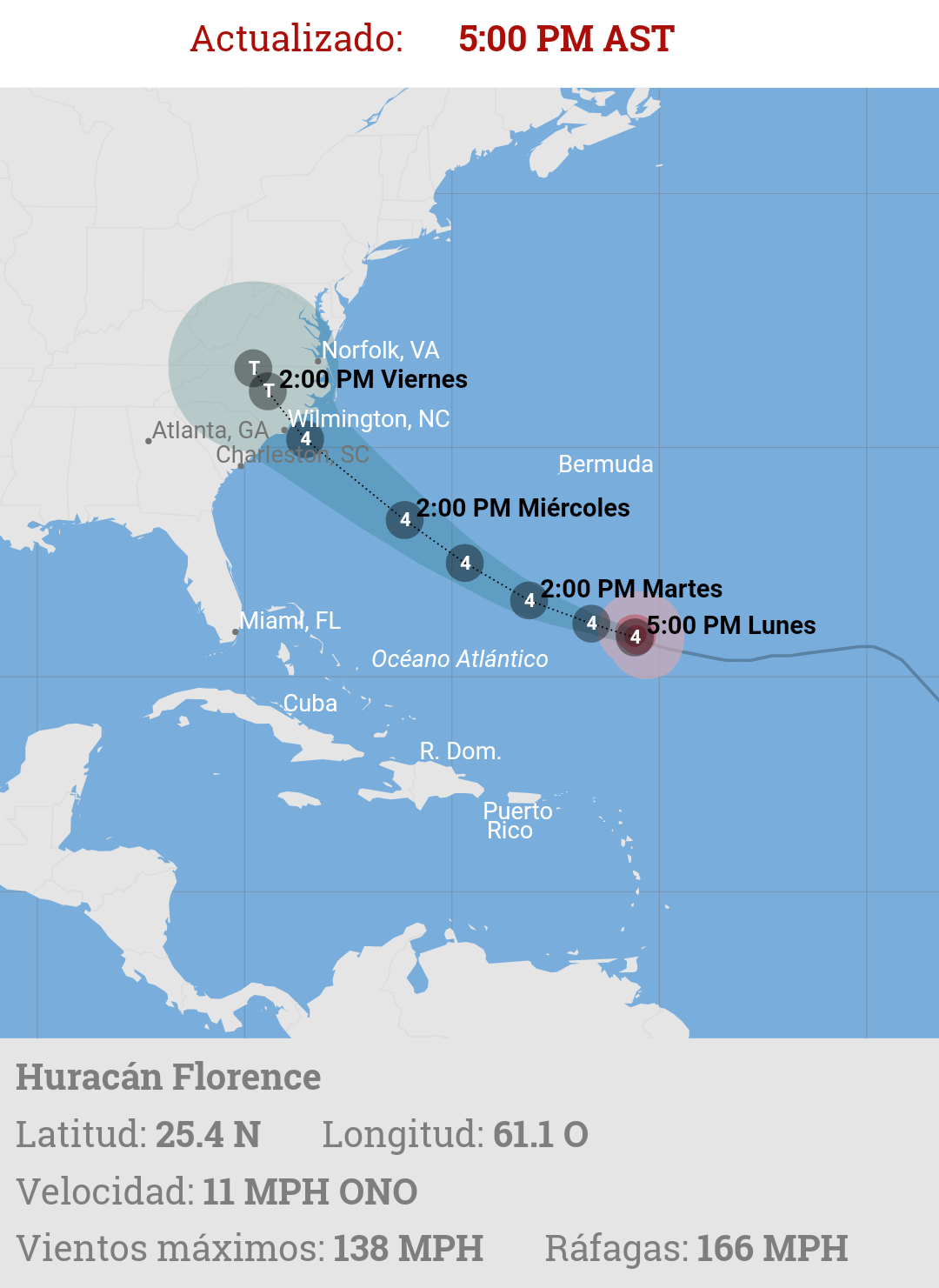 - El Centro Nacional de Huracanes con sede en Miami señaló que se esperan marejadas que pueden amenazar la vida de personas en la costas de Carolina del Norte y Carolina del Sur, así como vientos muy destructivos que comprometerán la infraestructura en esas zonas.