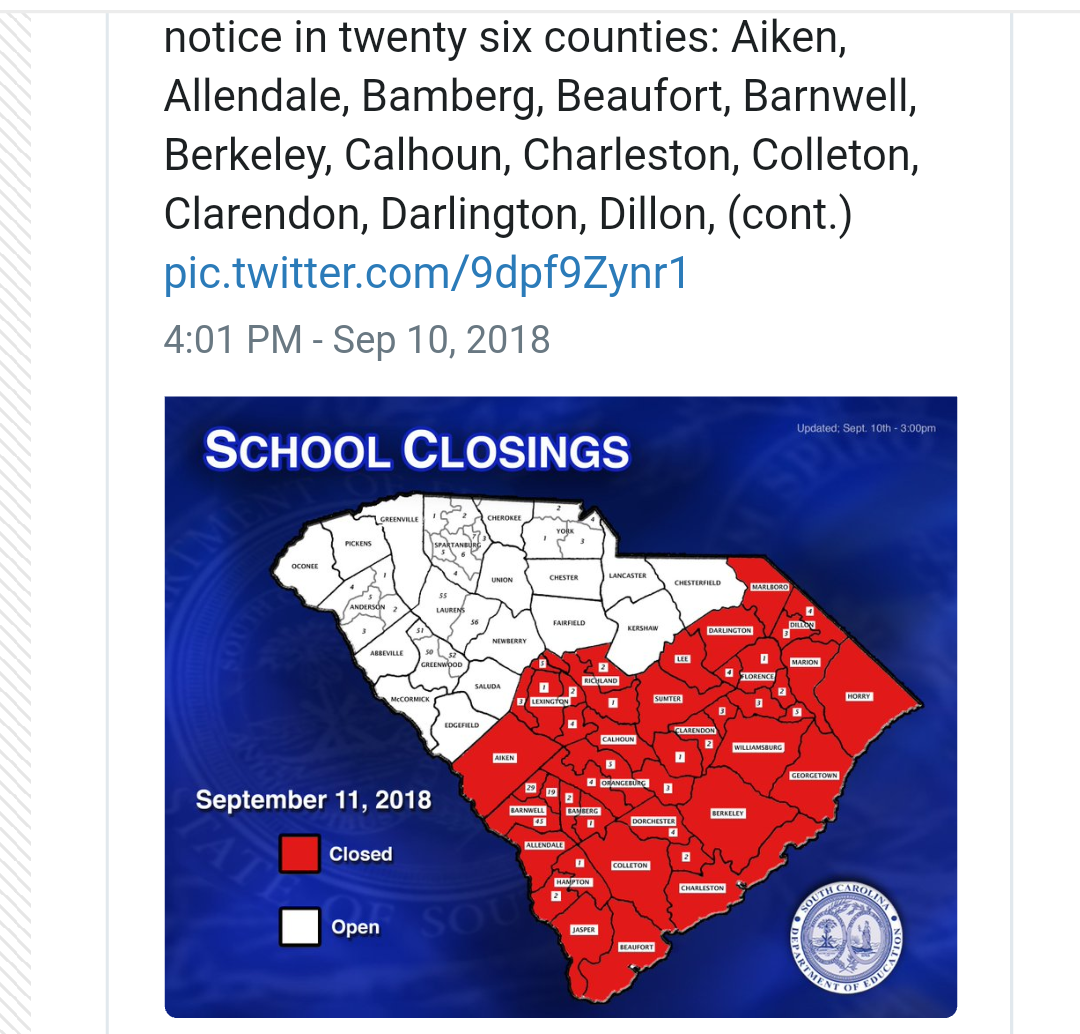 - Condado de Brunswick: evacuación voluntaria de áreas no incorporadas a partir del martes 11 de septiembre; evacuación obligatoria de áreas bajas e inundables, personas en viviendas precarias o móviles desde el martes 11 de septiembre.