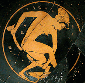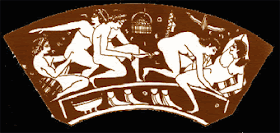 | Hetaira con olisbos. Cerámica encontrada en una urna funeraria egipcia, de entre 600 a 300 a.C. Copa de Epicteto, Museo Ermitage, San Petesburgo. |
