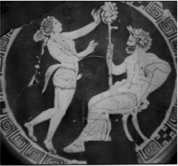También tendría un significado ritual la imagen de esta copa ática, donde se ve a una mujer, una sacerdotisa de Dionisio, realizando una danza ritual ante el propio dios, donde destaca el falo que porta la mujer. Aunque se pueden buscar todo tipo de explicaciones sobre la presencia de este falo (travestismo, hermafroditismo, …) y la importancia de los elementos de travestismo en los rituales dionisíacos, como símbolo de subversión. Podemos interpretarlo como la opción más sencilla, una mujer portando una prenda fálica. Una prenda fálica que como veremos no sólo se utilizó en ritos dionisíacos o de fertilidad, sino también para el placer de mujeres y, seguramente, hombres también.