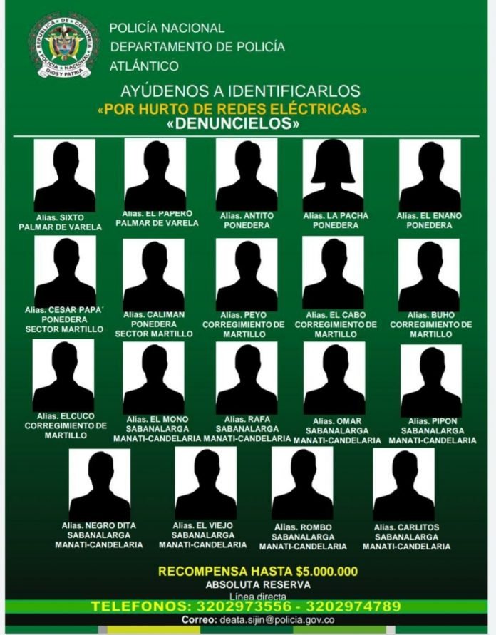 Barranquilla, agosto 24 de 2020. Gobernación del Atlántico. Con 19 figuras sin rostro, pero identificadas con sus alias y los municipios donde han realizado sus hurtos, la Policía Departamento del Atlántico, Deata, dio a conocer el cartel de los más buscados por hurto de redes eléctricas en esta zona del país.