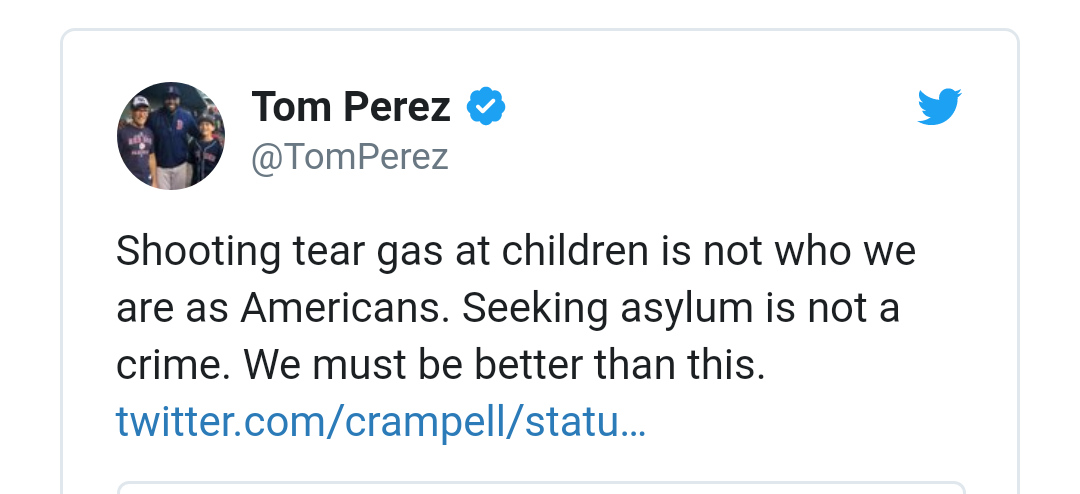«Disparar gases lacrimógenos contra niños no es lo que somos como estadounidenses», escribió Tom Pérez, presidente del Comité Nacional Demócrata. «Buscar asilo no es un delito. Debemos ser mejores que esto».