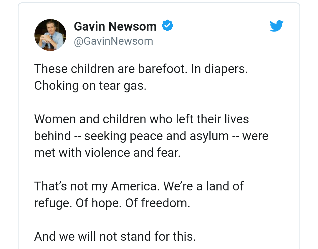 Gavin Newsom, el gobernador electo de California, argumentó que las imágenes de niños que salen corriendo del gas lacrimógeno van en contra de los ideales estadounidenses. «Estos niños están descalzos. En pañales. Ahogándose con gas lacrimógeno», tuiteó el político. «Las mujeres y los niños que dejaron sus vidas atrás, buscando la paz y el asilo, se encontraron con violencia y temor. Esa no es mi EE.UU. Somos una tierra de refugio. De esperanza. De libertad. Y no vamos a soportar esto».
