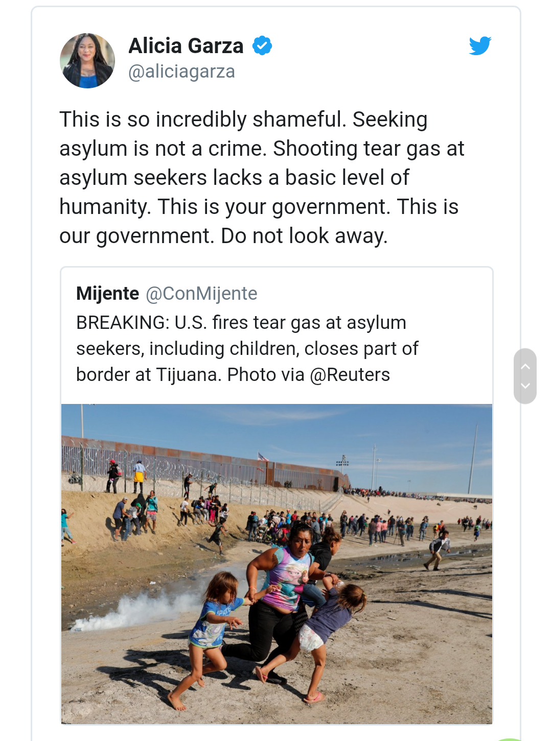 Por su parte, Alicia Garza, cofundadora del movimiento ‘Black Lives Matter’ (‘Las Vidas Negras Importan’), denunció que «disparar gas lacrimógeno contra los solicitantes de asilo carece de un nivel básico de humanidad». «Este es tu Gobierno. Este es nuestro Gobierno. No miren hacia otro lado», escribió la activista.