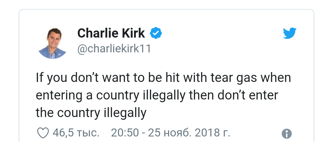 Sin embargo, algunos activistas de derecha expresaron la opinión de que los migrantes podían evitar esta situación al no intentar cruzar la frontera «ilegalmente». «Si no quieres que te ataquen con gas lacrimógeno al ingresar ilegalmente a un país, no ingreses ilegalmente al país», apuntó Charlie Kirk, fundador de la organización sin ánimo de lucro Turning Point USA.