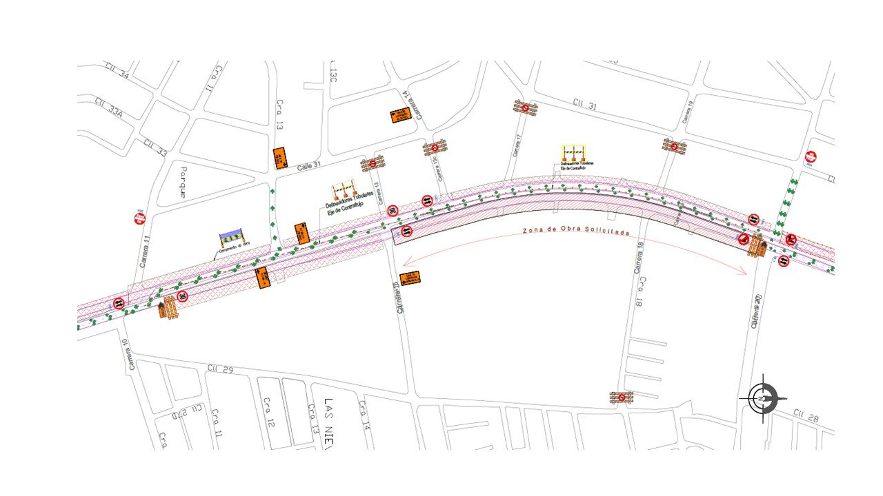 Los usuarios que se desplazan de sur a norte sobre la Calle 30, tomarán un carril en contraflujo sobre la calzada no intervenida entre las Carreras 15 y 20, para continuar hasta sus destinos.
