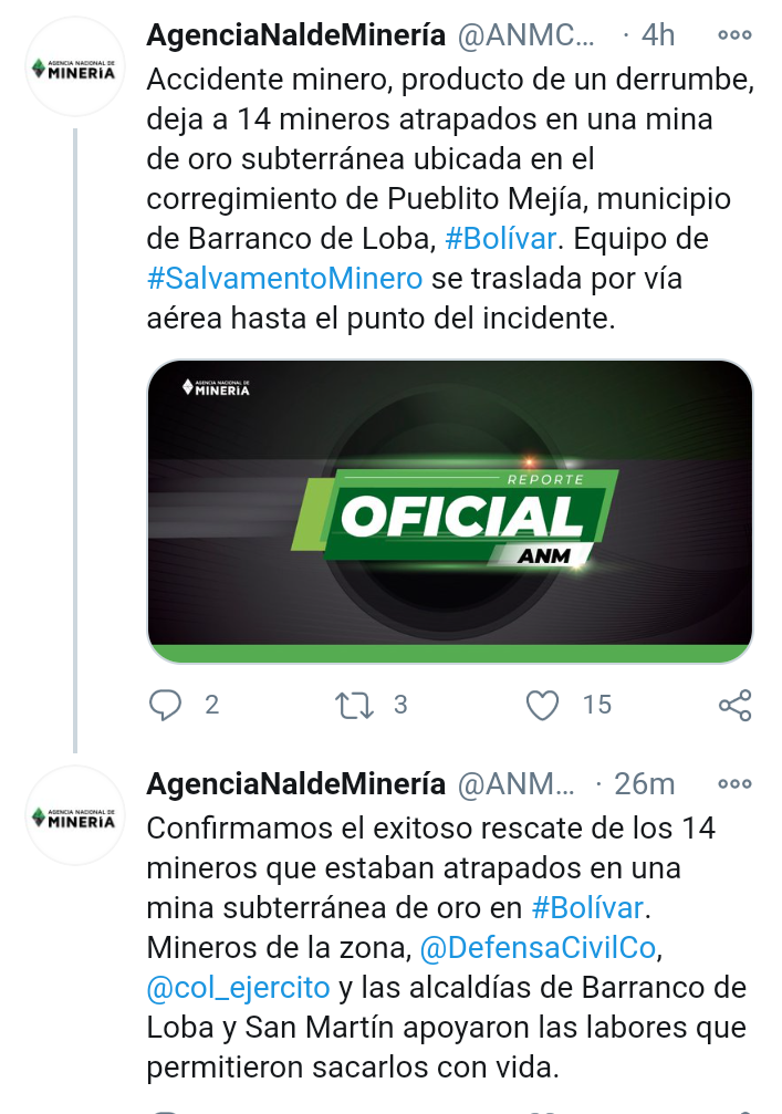 El Gobierno Nacional confirmó que los 14 mineros que habían quedado atrapados en un socavón del municipio de Barranco de Loba, en Bolívar , fueron rescatados con vida.