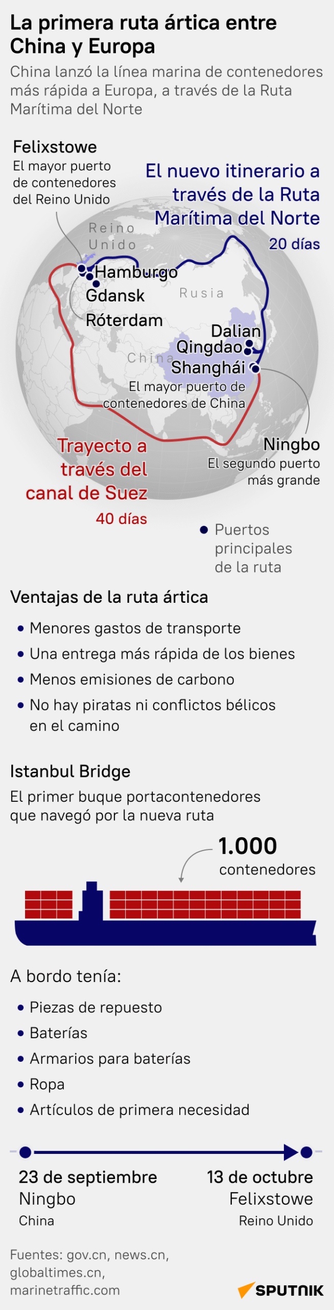 Un buque que transportaba casi 25.000 toneladas de contenedores llegó este lunes al puerto británico de Felixstowe luego de partirel 23 de septiembre de la terminal china de Ningbo-Zhoushan, en la provincia oriental de Zhejiang. «El viaje por el Ártico ruso duró 20 días, casi la mitad del tiempo que tomaría por las rutas tradicionales del sur», indicó la corporación nuclear estatal rusa Rosatom, administradora de la vía y cuya empresa Glavsevmorput proporcionó apoyo de navegación al buque a lo largo del trayecto.