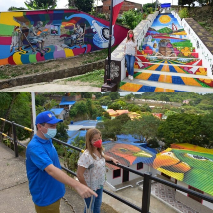 La Gobernadora también llegó hasta el mural de las escaleras, ubicado en la zona cercana a la plaza Julio Flórez, donde artistas usiacureños y regionales iniciaron la transformación de espacios comunes con arte y color. Las escaleras resaltan la tradición artesana, la historia del municipio y los referentes identitarios de Usiacurí; por su parte, el mural al costado refleja a las personas, las familias y comunidad que han sido las encargadas de transmitir saberes y fortalecer la apropiación comunitaria.